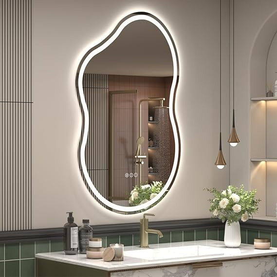 A stunning organic-shaped mirror that adds a modern artistic touch to your bathroom or vanity space, blending luxury with contemporary aesthetics.