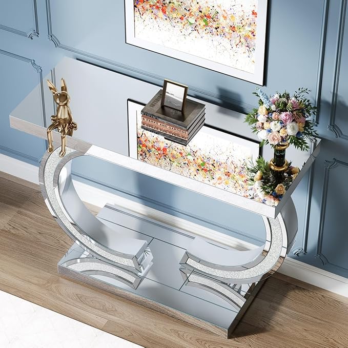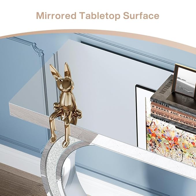 ·Glamorous Design – Features a mirrored glass top and sculptural C-shaped base with crushed diamond inlay for a sparkling, luxurious look.