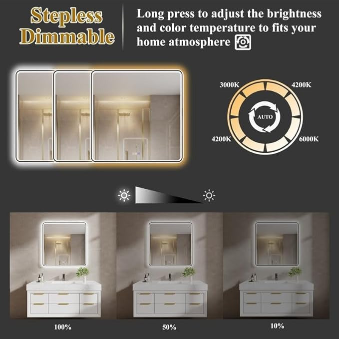 · 💡 3-Color Dimmable Lighting: Choose from warm, neutral, or cool white tones and adjust brightness to create the perfect ambiance for your bathroom or vanity.
